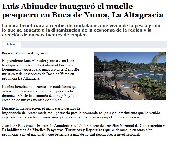 “The rehabilitation of the Boca de Yuma pier would include, in addition to the breakwater, an area for docking fishing boats and a warehouse for fishermen, as well as a surveillance area”.